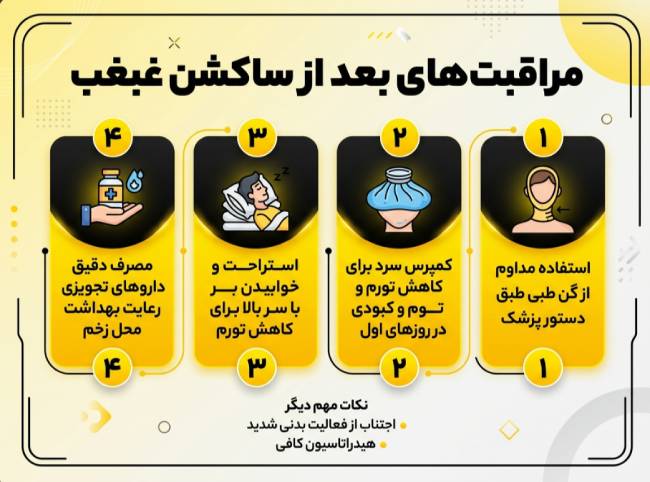 توصیه اکید به استفاده از کمپرس سرد در ۴۸ ساعت اول و سپس کمپرس گرم، به همراه مصرف کپسول‌های آناهیل (عصاره آناناس) که سرعت ترمیم بافت را چند برابر می‌کند.
